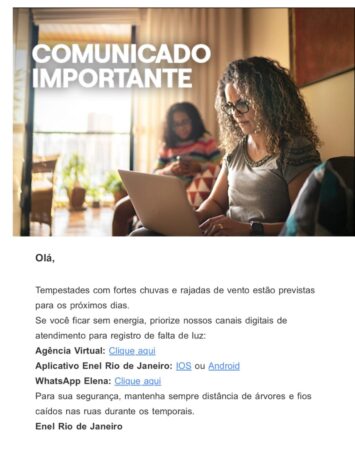 No e-mail, a Enel informa os canais de atendimento que devem ser buscados para comunicação de interrupção no fornecimento de energia elétrica.