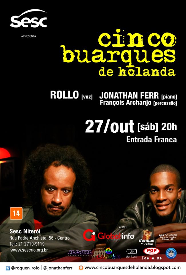 Show: Cinco Buarques de Holanda | Artistas: Rollo (voz), Jonathan Ferr (piano), François Archanjo (percussão) | Data: 27/10 (sábado) | Hora: 20h | Local: SESC Niterói – Rua Padre Anchieta, 56 | Centro | Niterói | RJ | Tel.: (21) 2719-9119 | Entrada Franca | Classificação: 14 anos | Blog: http://cincobuarquesdeholanda.blogspot.com.br/