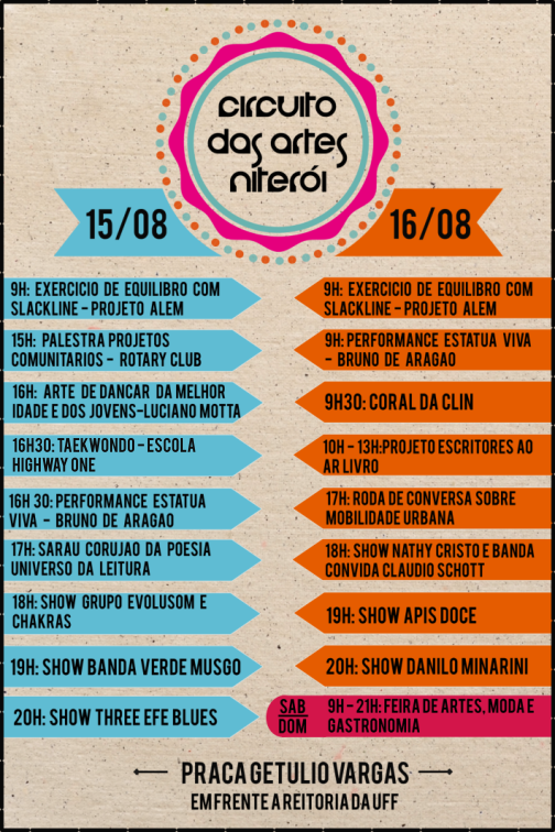 Nesta edição, mais novidades serão apresentadas, como Arte de Dançar da Melhor Idade, exibição de taekwondo, exercício de equilíbrio com Slackline, além de música, moda, dança, oficinas e outras manifestações culturais, com direito a uma variada gastronomia. Tudo isso acontece na Praça Getúlio Vargas, em Icaraí, em frente à Reitoria da Universidade Federal Fluminense, sábado e domingo, das 9 hrs, às 21 hrs, com entrada franca. A parte musical, sempre a partir das 19 horas, ficará a cargo do Grupo Evolusom e Chakras , da Banda Verde Musgo e Three Efe Blues, no sábado, e Nathy Cristo e Banda, Apis Doce e Danilo Minarini, no domingo.