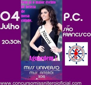 Está chegando o tão aguardado dia de conhecer a musa de Niterói nesse ano! No próximo dia 4 de julho, o Praia Clube São Francisco será palco do “Miss Niterói 2012”, evento que faz parte da organização oficial do Miss Mundo. Venha prestigiar e ver de perto as mais lindas mulheres da nossa cidade!