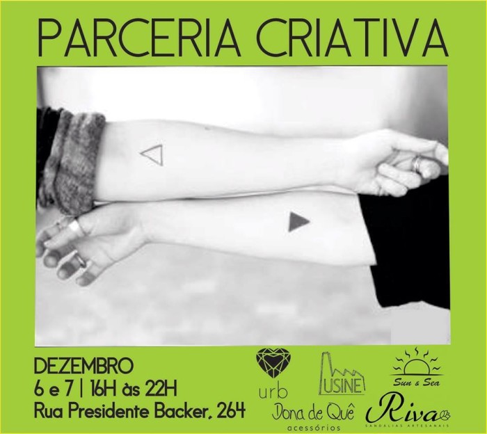 O encontro do melhor da moda niteroiense está no evento “Parceria Criativa”.  As marcas da cidade, Urb, Usine e Riva Sandálias Artesanais, Dona De Quê e Sun & Sea Biquinis se juntaram para realizar a mais sofisticada apresentação de seus produtos, numa programação de muito estilo, classe e boa música. Parceria Criativa, o evento que faltava em Niterói!