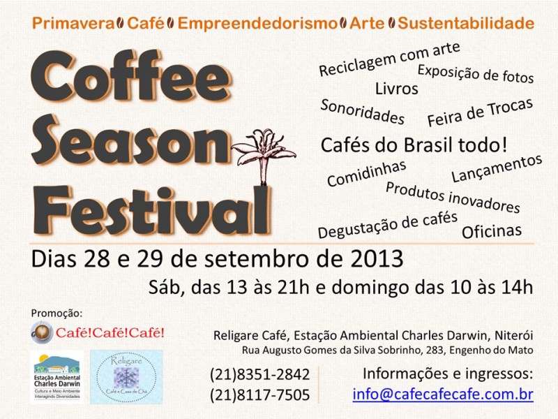 Nada como um bom cafezinho, não é mesmo? Nos próximos dias 28 e 29 de setembro, Niterói apresentará seu primeiro festival do café, o “Coffee Season Festival”. O encontro reserva diversas atividades da história da iguaria, que vão desde degustação dos melhores estilos da bebida, até exposições artísticas e lançamentos de novos produtos! O evento será realizado no Religare Café, Estação Ambiental Charles Darwin, no Engenho do Mato.