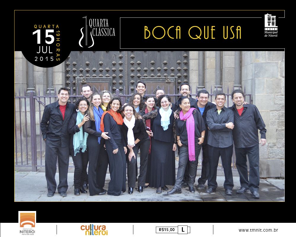 O Grupo Vocal Boca que Usa se apresenta no Teatro Municipal de Niterói na quarta-feira, 15 de julho de 2015, a partir das 19h, em mais uma edição doprojeto Quarta Clássica, trazendo ao público um repertório de coral inovador, com força harmônica e interpretativa, que abrange desde a música antiga até a contemporânea. Os ingressos custam R$ 15 reais.