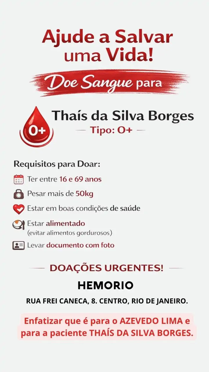 Quem puder ajudar deve comparecer ao Hemorio, no Centro da capital, na Rua Frei Caneca, e informar o nome da paciente no momento da doação.
