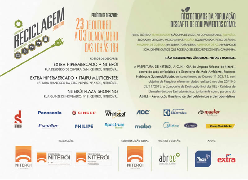 campanha_reciclagem1Uma Responsabilidade de Todos! A Prefeitura de Niterói, Secretaria do Meio Ambiente, Recursos Hídricos e Sustentabilidade e a CIA de Limpeza Urbana de Niterói – CLIN, em cumprimento ao decreto 11.203/12, com o objetivo de pesquisar e levantar dados, realizará de 23 de outubro a 03 de Novembro, a Campanha de destinação final dos REE – Resíduos Eletroeletrônicos e Eletrodomésticos – em parceria da ABREE – Associação Brasileira de Eletroeletrônicos e Eletrodomésticos.