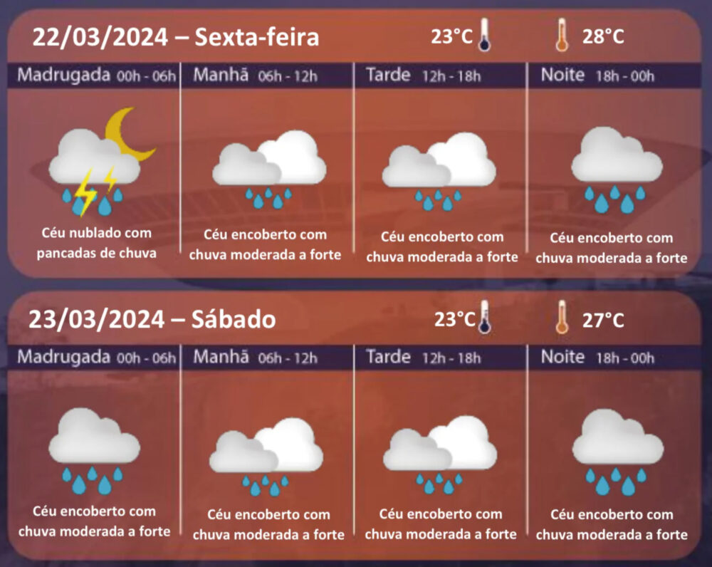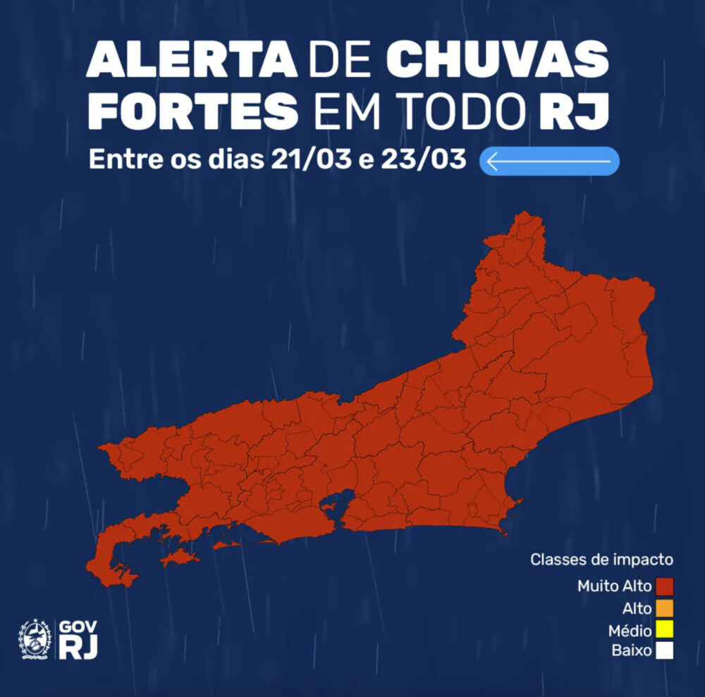 A previsão de alerta vermelha, programada para começar à meia-noite de sexta-feira e terminar às 10h de domingo, indica a possibilidade de chuvas intensas, com índice superior a 60 mm/h, e ventos fortes acima de 100 km/h.